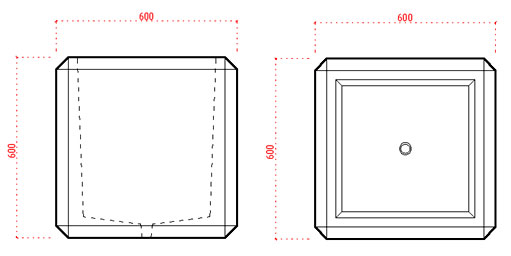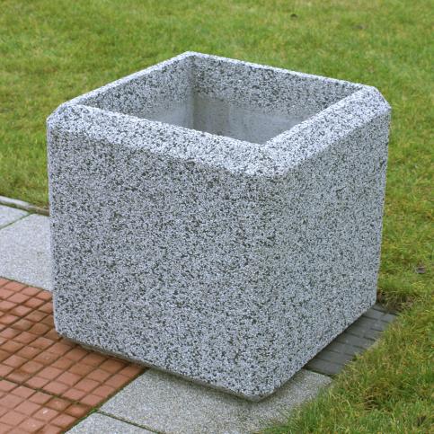 Donica betonowa, kwadratowa o wymiarach zewnętrznych: (dł. × szer. × wys.) 60x60x60cm. Posiada dno ze spadkiem 13% w kierunku otworu odwadniającego o wymiarach ø4cm górą zbieżne do dołu na ø3cm. Od góry i boków donicy fazowanie pojedyncze o długości 57mm po kątem 45. Wymiary wewnętrzny donicy: (dł. × szer.) 46×46cm. Grubość ścianki w górnej części równa 7cm, w dolnej 9cm. Wymiary dna donicy (dł. × szer.) 42×42cm. Głębokość wyrobu wynosi 53/55,5cm do dna. Wykończenie w technologii betonu płukanego.