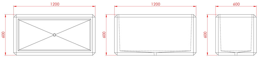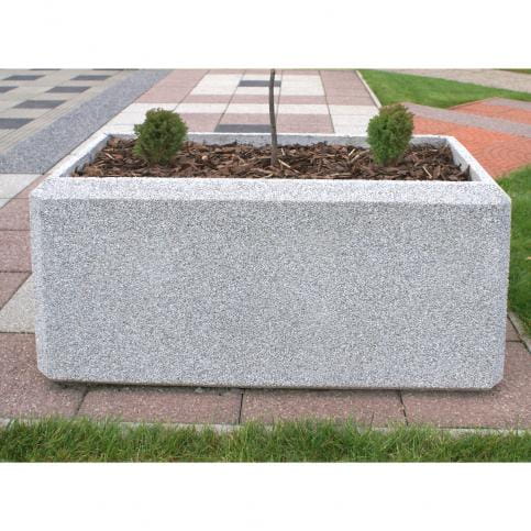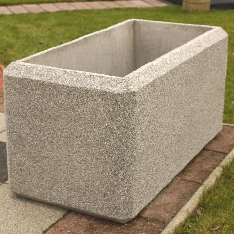 Donica betonowa, prostokątna o wymiarach zewnętrznych: (dł. × szer. × wys.) 120x60x60cm. Posiada dno ze spadkiem (na dł./szer.) 7/11% w kierunku otworu odwadniającego o wymiarach ø4cm górą zbieżne do dołu na ø3cm. Z każdej strony donicy fazowanie pojedyncze o długości 57mm pod kątem 45°. Wymiary wewnętrzny donicy: (dł. × szer.) 107×47cm. Grubość ścianki w górnej części równa 6,5cm, w dolnej 8cm. Wymiary dna donicy (dł. × szer.) 104×44cm. Głębokość wyrobu wynosi 53,5/56,5cm do dna. Wykończenie w technologii betonu płukanego.