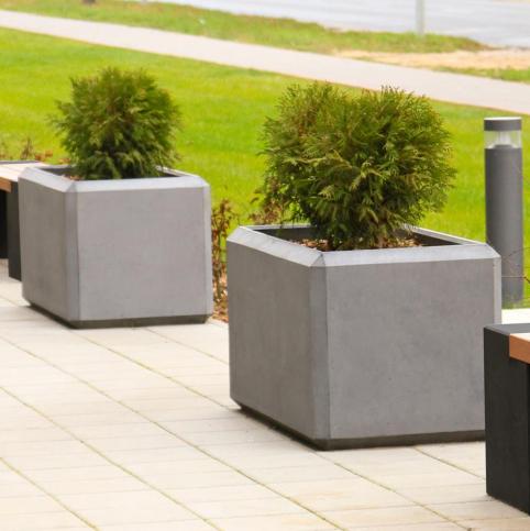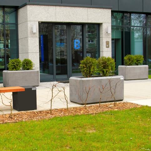 Donica Aldona — jej forma pozwala na zastosowanie nasadzeń z szerokiej gamy zieleni, do wykorzystania na dużych powierzchniach, również w komplecie z donicą Ada.