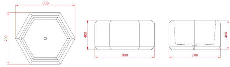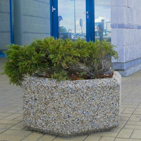 Donica betonowa, sześciokątna o wymiarach zewnętrznych: (dł. × szer. × wys.) 80,8×70x40cm. Posiada dno ze spadkiem 4,54% w kierunku otworu odwadniającego o wymiarach ø4cm górą zbieżne do dołu na ø3cm. Z każdej strony donicy fazowanie pojedyncze o długości 57mm po kątem 45° na górze, 61mm pod kątem 49° na dole. Wymiary wewnętrzny donicy: (dł. × szer.) 65,8×57cm. Grubość ścianki w górnej części (na długości/szerokości) równa 7,5/6,5cm, w dolnej10,4/9cm. Wymiary dna donicy (dł. × szer.) 60×52cm. Głębokość wyrobu wynosi 32,5/34cm do dna. Wykończenie w technologii betonu płukanego.