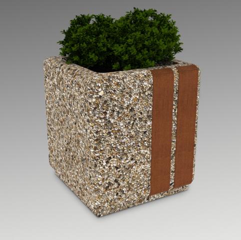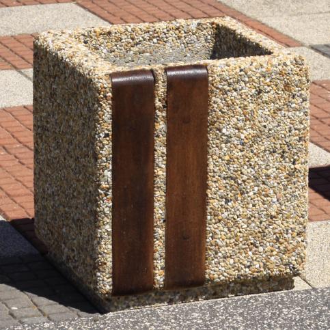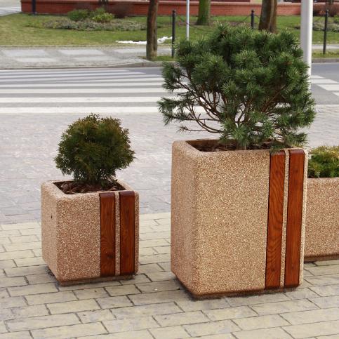 Donica betonowa, kwadratowa o wymiarach zewnętrznych: (dł. × szer. × wys.) 40x40x45cm. Donica wykonana w technologii betonu płukanego. Donica wyposażona jest w otwór odwadniający. Donica nie nadaje się do stosowania w miejscach narażonych na działanie soli odladzających.