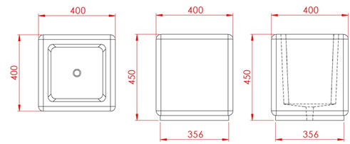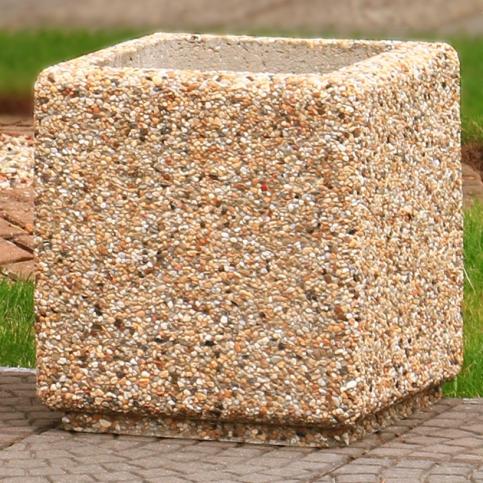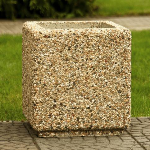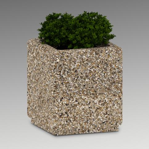 Donica betonowa, kwadratowa o wymiarach zewnętrznych: (dł. × szer. × wys.) 40x40x45cm. Donica wykonana w technologii betonu płukanego. Donica wyposażona jest w otwór odwadniający. Wyrób nie nadaje się do stosowania w miejscach narażonych na kontakt z solami odladzającymi.
