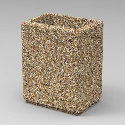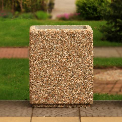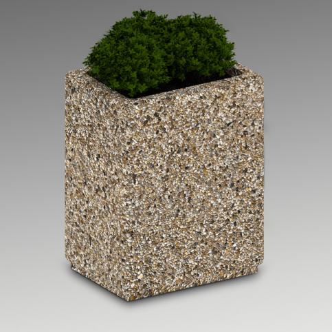 Donica betonowa, prostokątna o wymiarach zewnętrznych: (dł. × szer. × wys.) 55x40x70cm. Donica wykonana w technologii betonu płukanego. Donica wyposażona została w otwór odwadniający. Wyrób nie nadaje się do stosowania w miejscach narażonych na kontakt z solami odladzającymi.