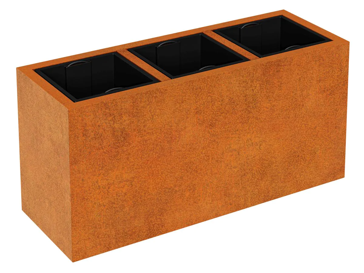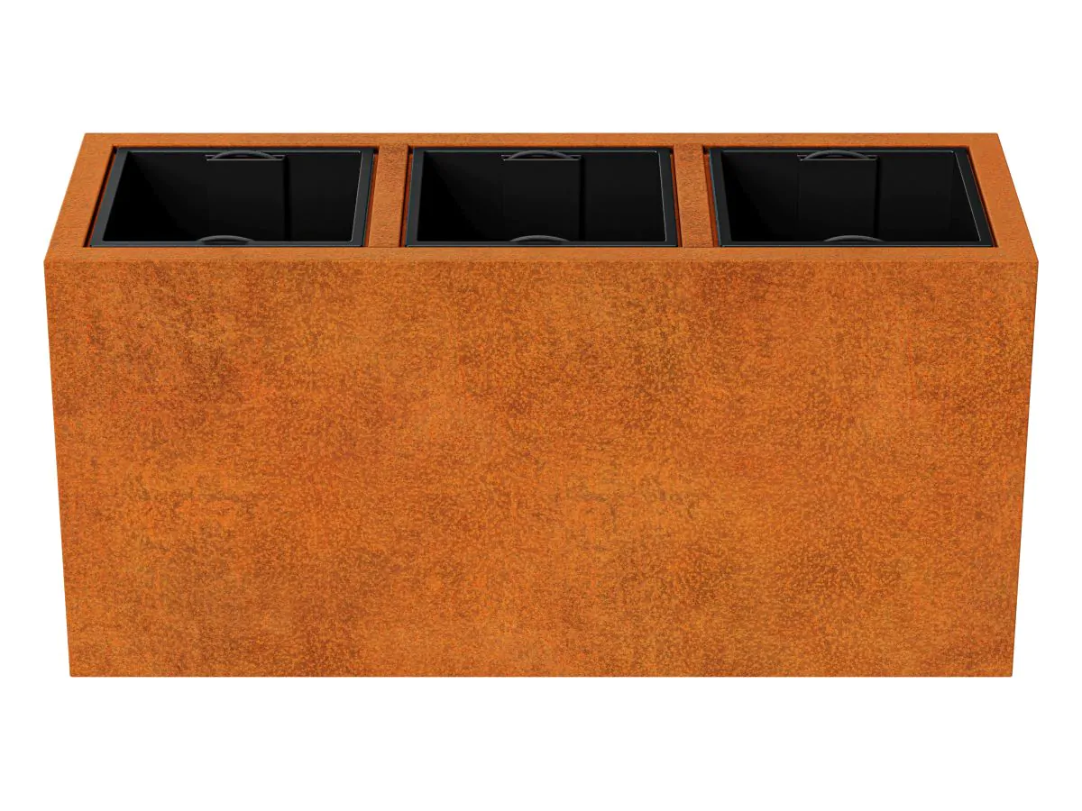 DEPO9 to donica ogrodowa wykonana ze stali cortenowej o grubości 2mm przeznaczona do sadzenia roślin w plastikowych, wyjmowalnych pojemnikach, dołączonych do zestawu. W standardzie donica wyposażona jest w nóżki.