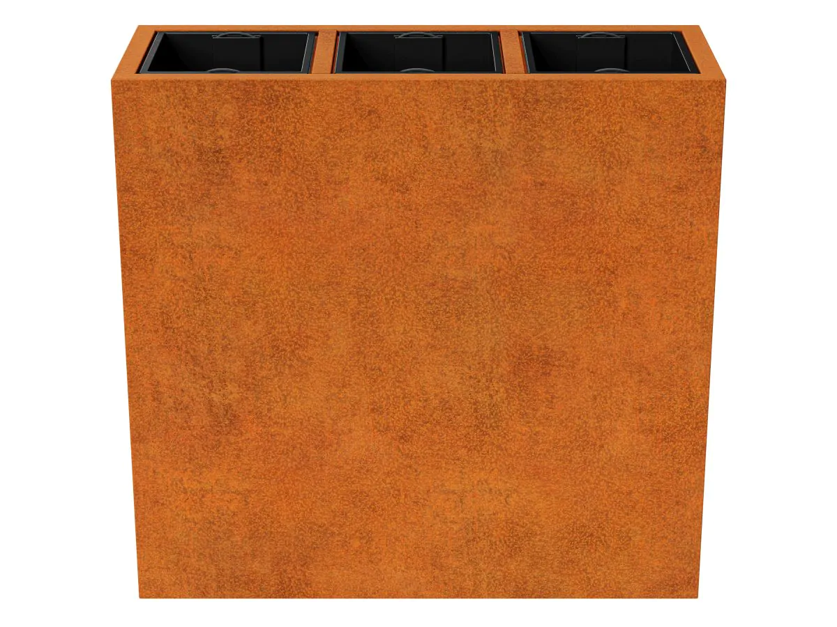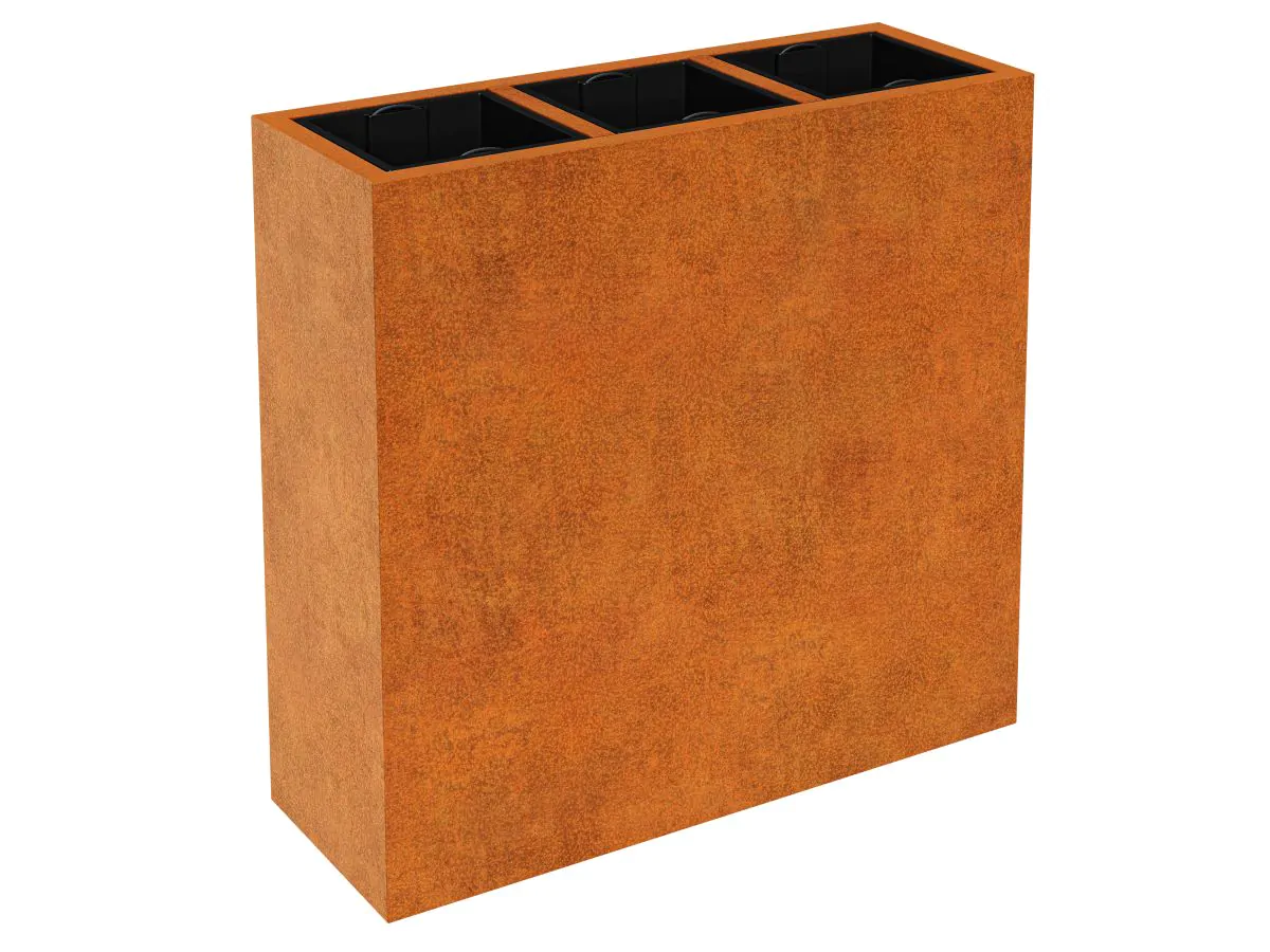 DEPO12 to donica ogrodowa wykonana ze stali cortenowej o grubości 2mm przeznaczona do sadzenia roślin w plastikowych, wyjmowalnych pojemnikach, dołączonych do zestawu. W standardzie donica wyposażona jest w nóżki.