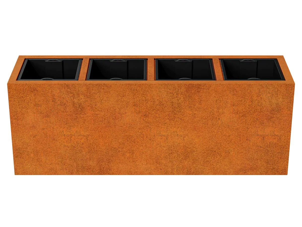 DEPO14 to donica ogrodowa wykonana ze stali cortenowej o grubości 2mm przeznaczona do sadzenia roślin w plastikowych, wyjmowalnych pojemnikach, dołączonych do zestawu. W standardzie donica wyposażona jest w nóżki.