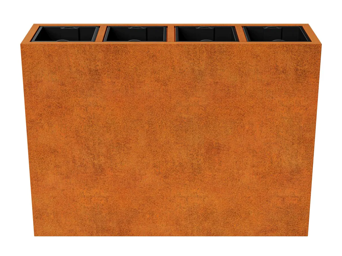 DEPO16 to donica ogrodowa wykonana ze stali cortenowej o grubości 2mm przeznaczona do sadzenia roślin w plastikowych, wyjmowalnych pojemnikach, dołączonych do zestawu. W standardzie donica wyposażona jest w nóżki.
