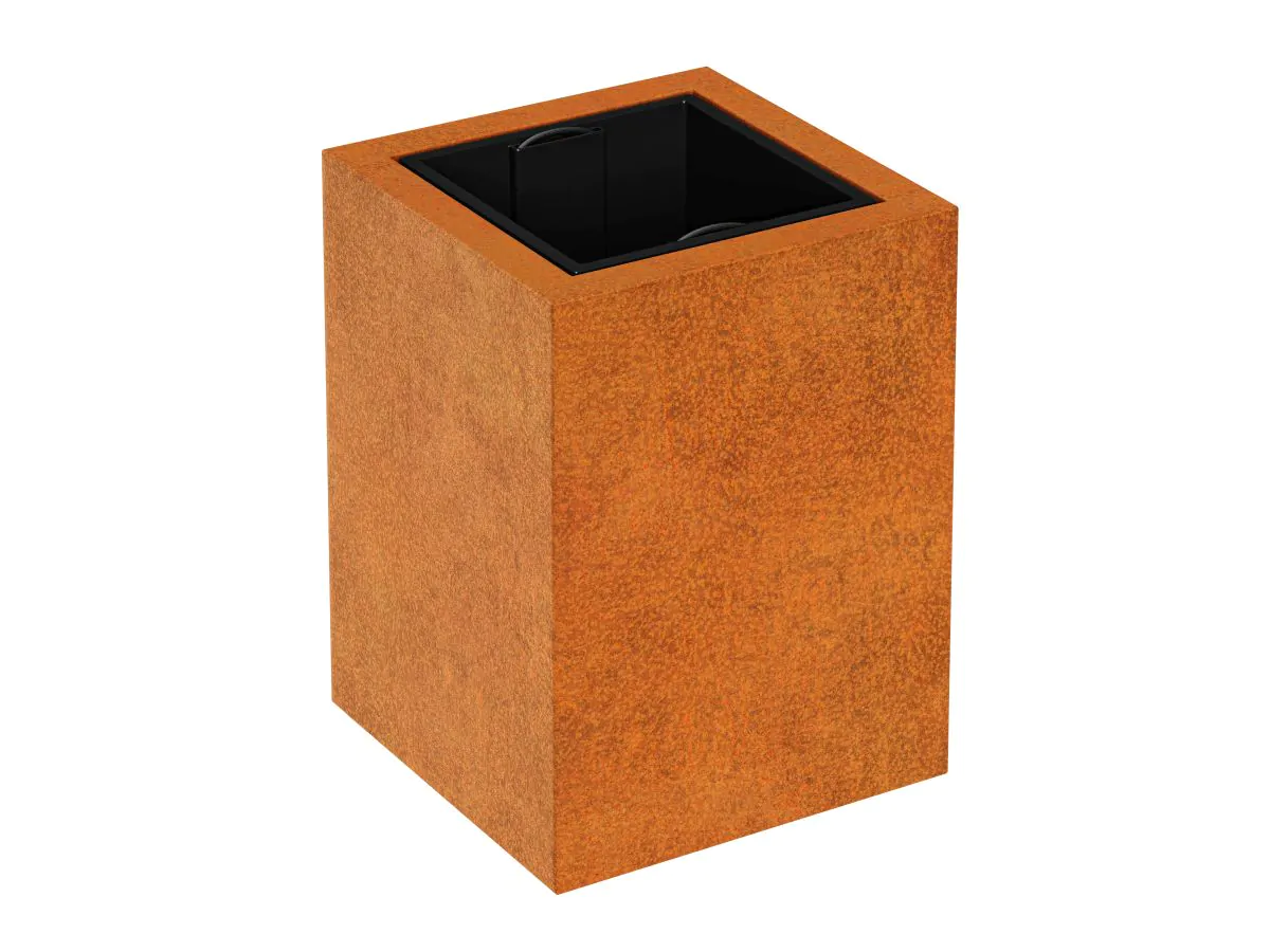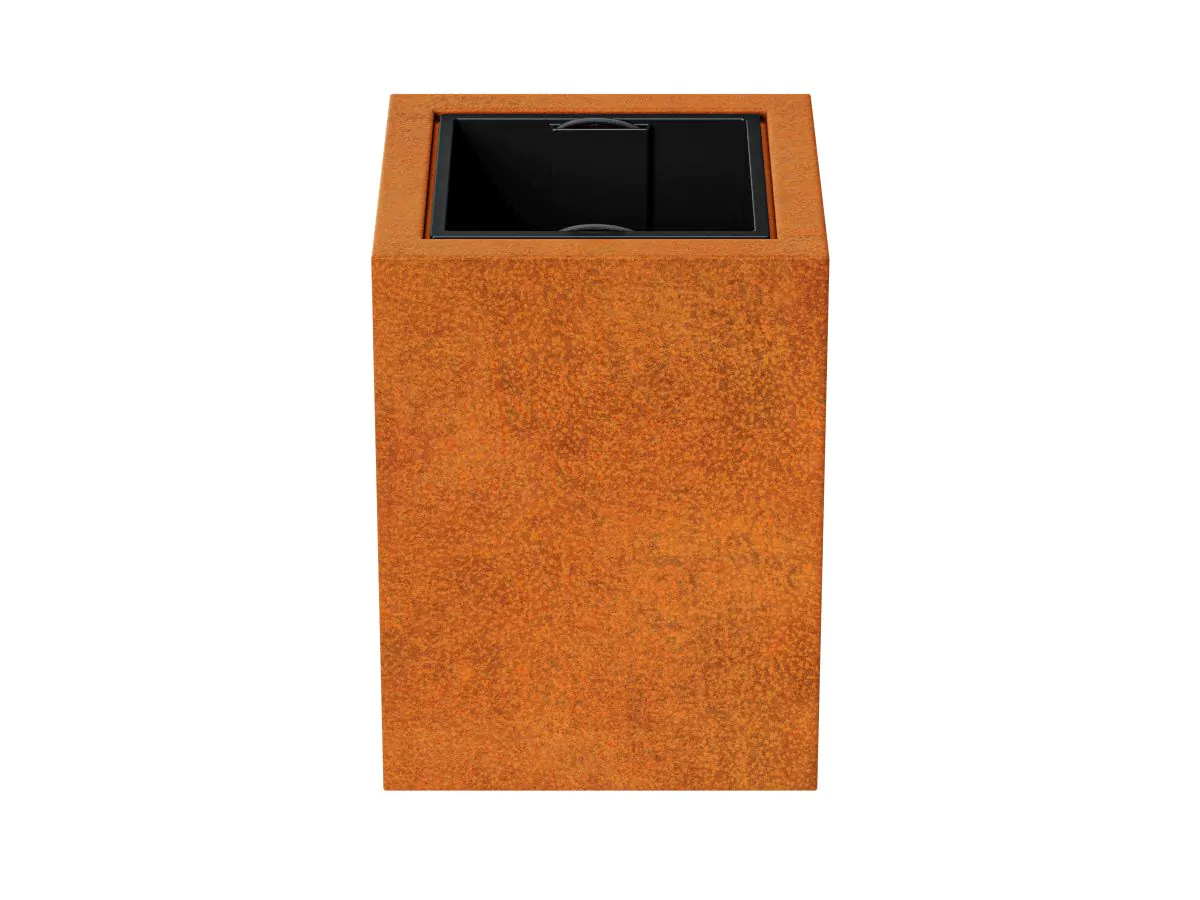 DEPO2 to donica ogrodowa wykonana ze stali cortenowej o grubości 2mm przeznaczona do sadzenia roślin w plastikowych, wyjmowalnych pojemnikach, dołączonych do zestawu. W standardzie donica wyposażona jest w nóżki.