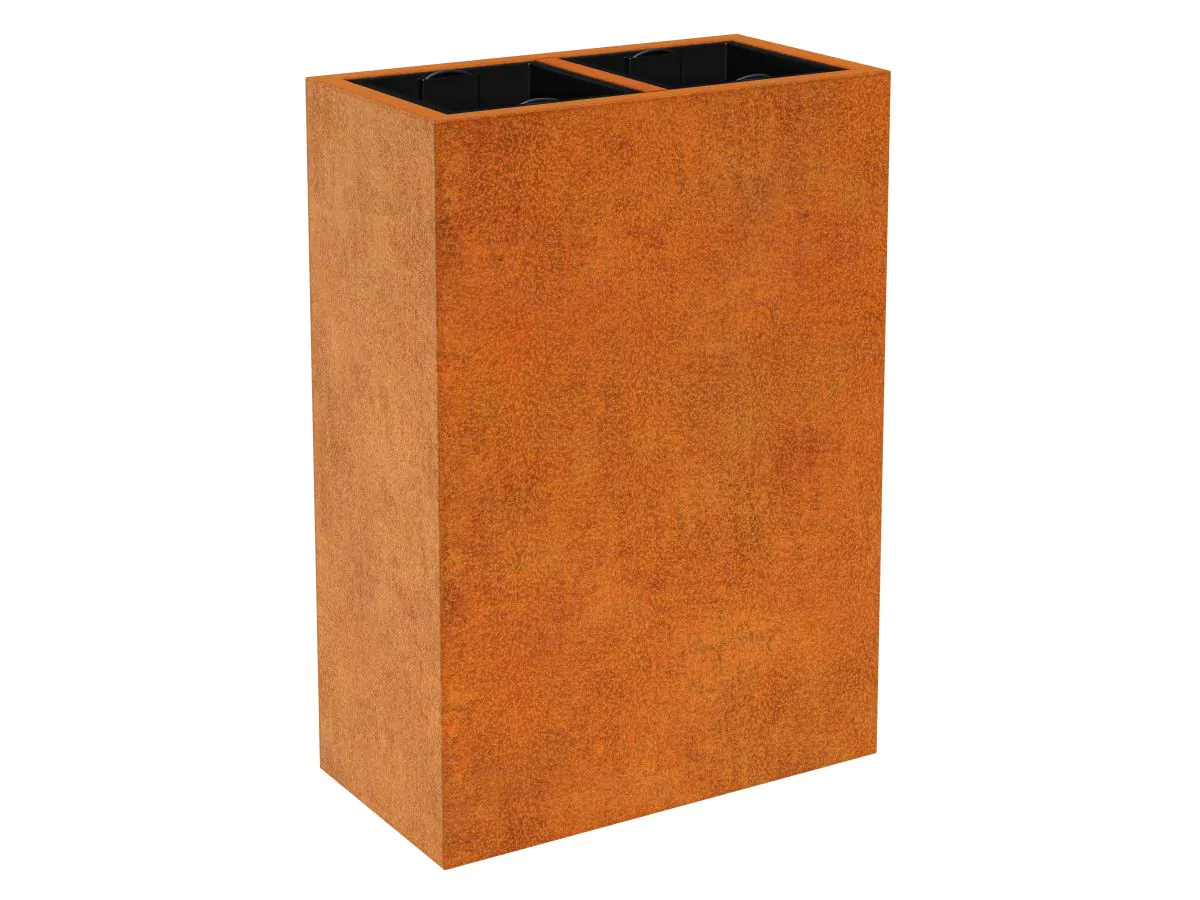 DEPO8 to donica ogrodowa wykonana ze stali cortenowej o grubości 2mm przeznaczona do sadzenia roślin w plastikowych, wyjmowalnych pojemnikach, dołączonych do zestawu. W standardzie donica wyposażona jest w nóżki.