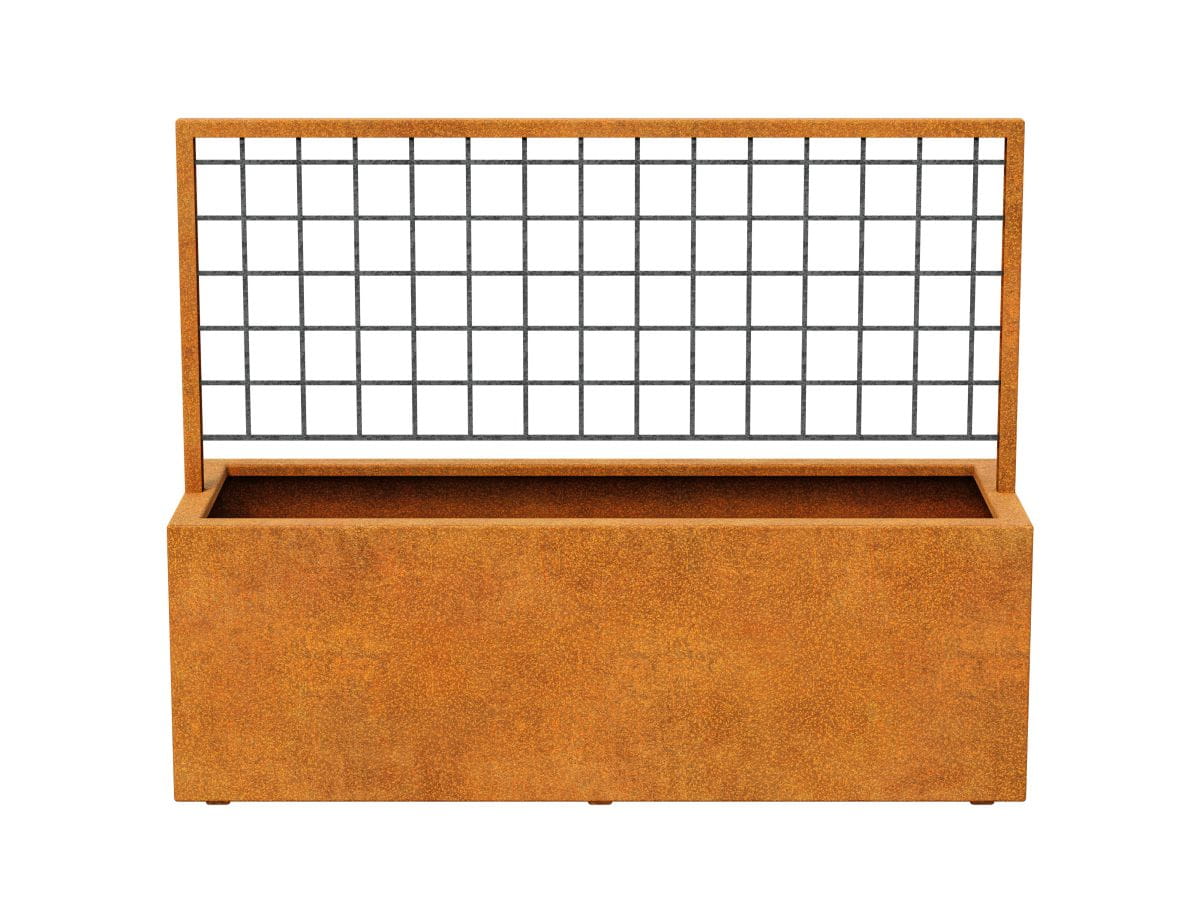RED CENTRO 4 to donica z siatką umiejscowioną na środku. Wyprodukowana z blachy cor-ten 2 mm. Wyposażona nóżki oraz otwory odpływowe. Znajdzie zastosowanie w restauracjach, ogrodach, starówkach miejskich, tarasach, balkonach czy częściach wspólnych obiektów deweloperskich. Możliwość umiejscowienia wszelkiego rodzaju pnącz czy kwiatów.