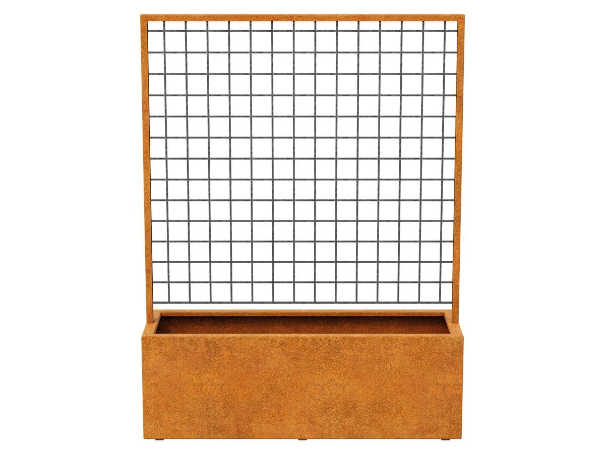 RED CENTRO 7 to donica z siatką umiejscowioną na środku. Wyprodukowana z blachy cor-ten 2 mm. Wyposażona nóżki oraz otwory odpływowe. Znajdzie zastosowanie w restauracjach, ogrodach, starówkach miejskich, tarasach, balkonach czy częściach wspólnych obiektów deweloperskich. Możliwość umiejscowienia wszelkiego rodzaju pnącz czy kwiatów.