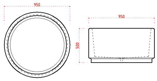Donica betonowa, okrągła o średnicy zew. ø95cm, wew. ø85cm, wys. 50cm. Wyrób posiada otwór odwadniający o średnicy ø4cm górą, zbieżny do dołu na ø2cm. Donica posiada fazkę pojedynczą o szerokości 3,8cm skierowaną do wew. pod kątem 33°, stanowiącą przejście do  podstawy o średnicy ø88cm, wys. 5,5cm. Głębokość donicy do dna równa 41/43,5cm. Ścianka wyrobu od góry o grubości 5cm, zaokrąglona łukiem o promieniu r=2,8cm. Średnica  wew. dna donicy równa ø78cm. Wykończenie w technologii betonu płukanego.