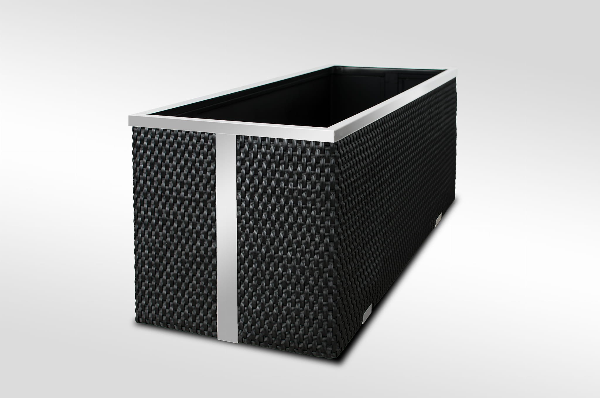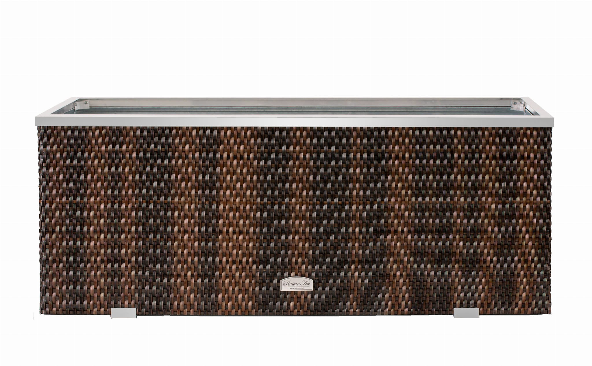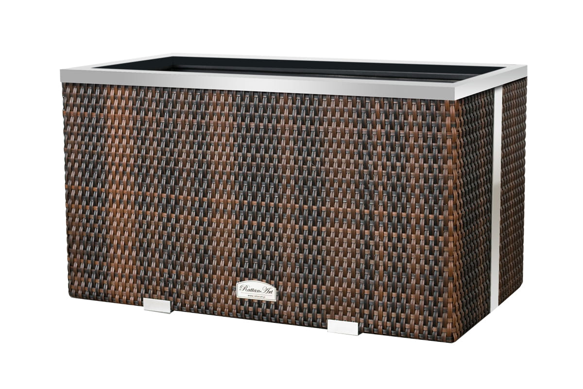 Donica wewnętrznie wykonana z blachy ocynkowanej, zewnętrznie technorattan oraz aluminium polerowane. Przystosowana do bezpośredniego sadzenia roślin.