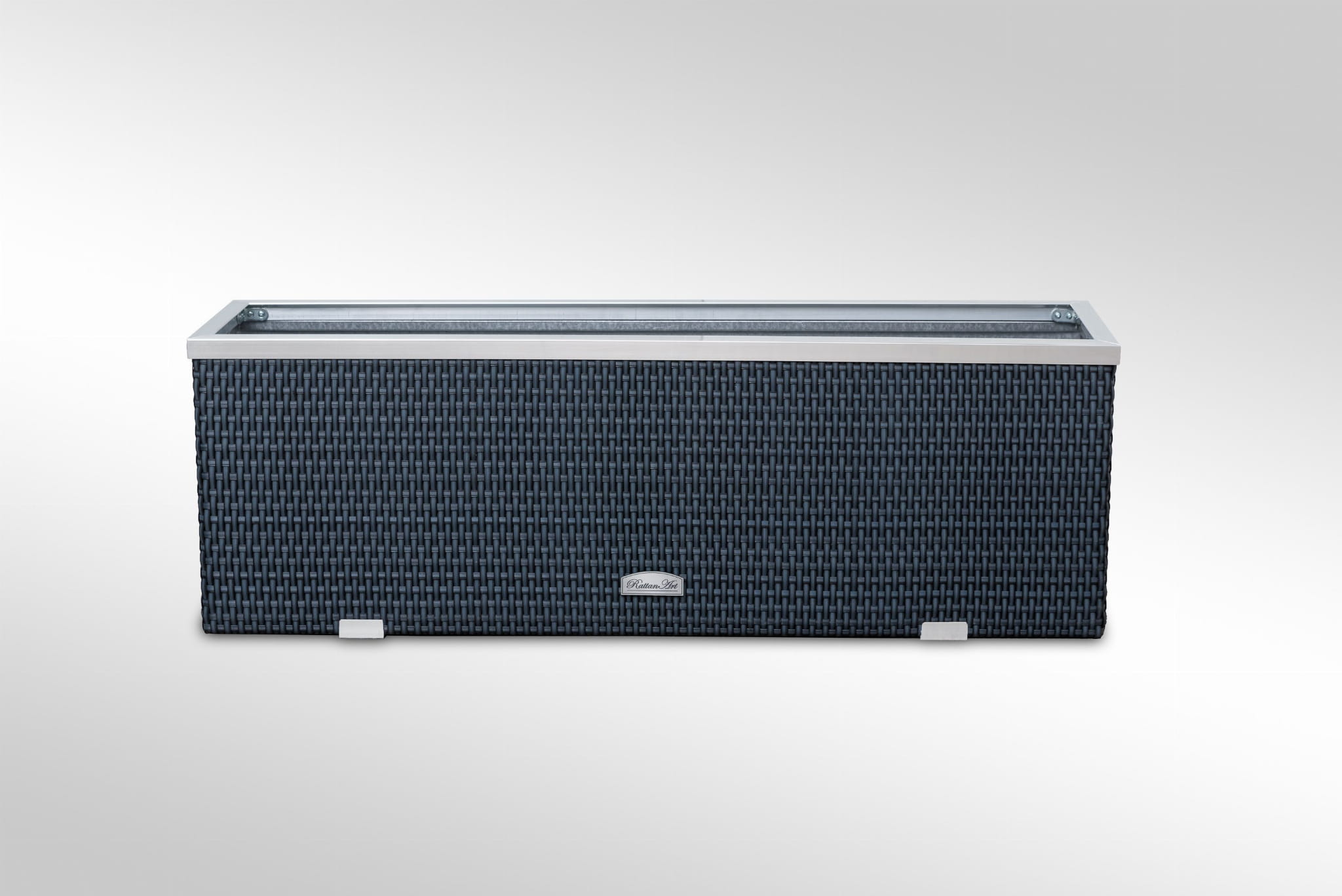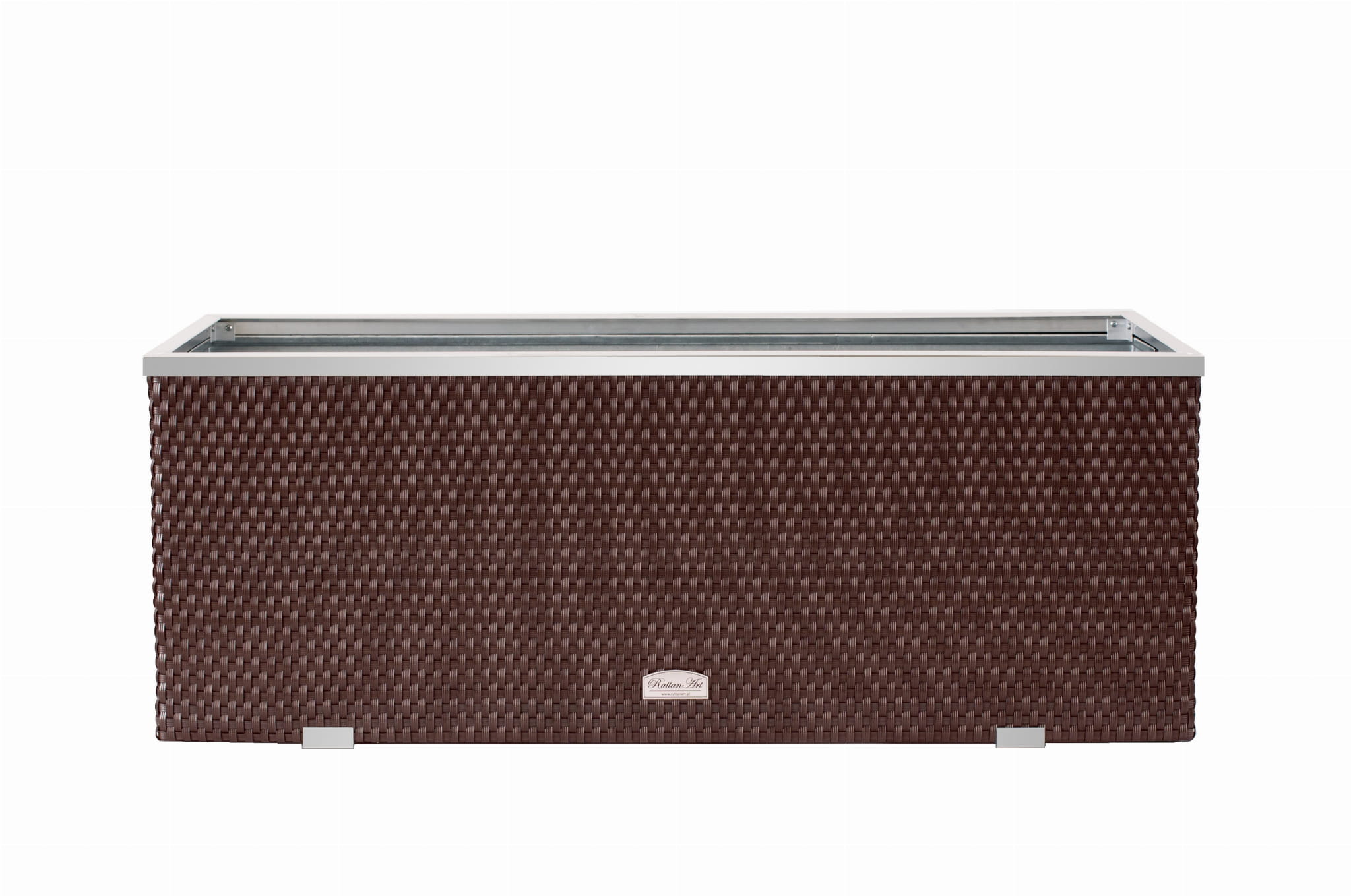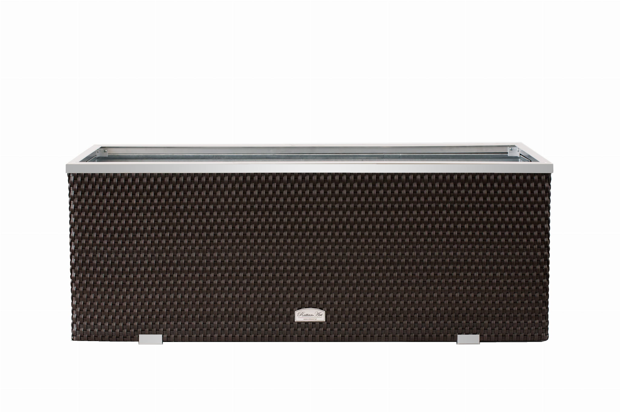 Donica wewnętrznie wykonana z blachy ocynkowanej, zewnętrznie technorattan oraz aluminium polerowane. Przystosowana do bezpośredniego sadzenia roślin.
