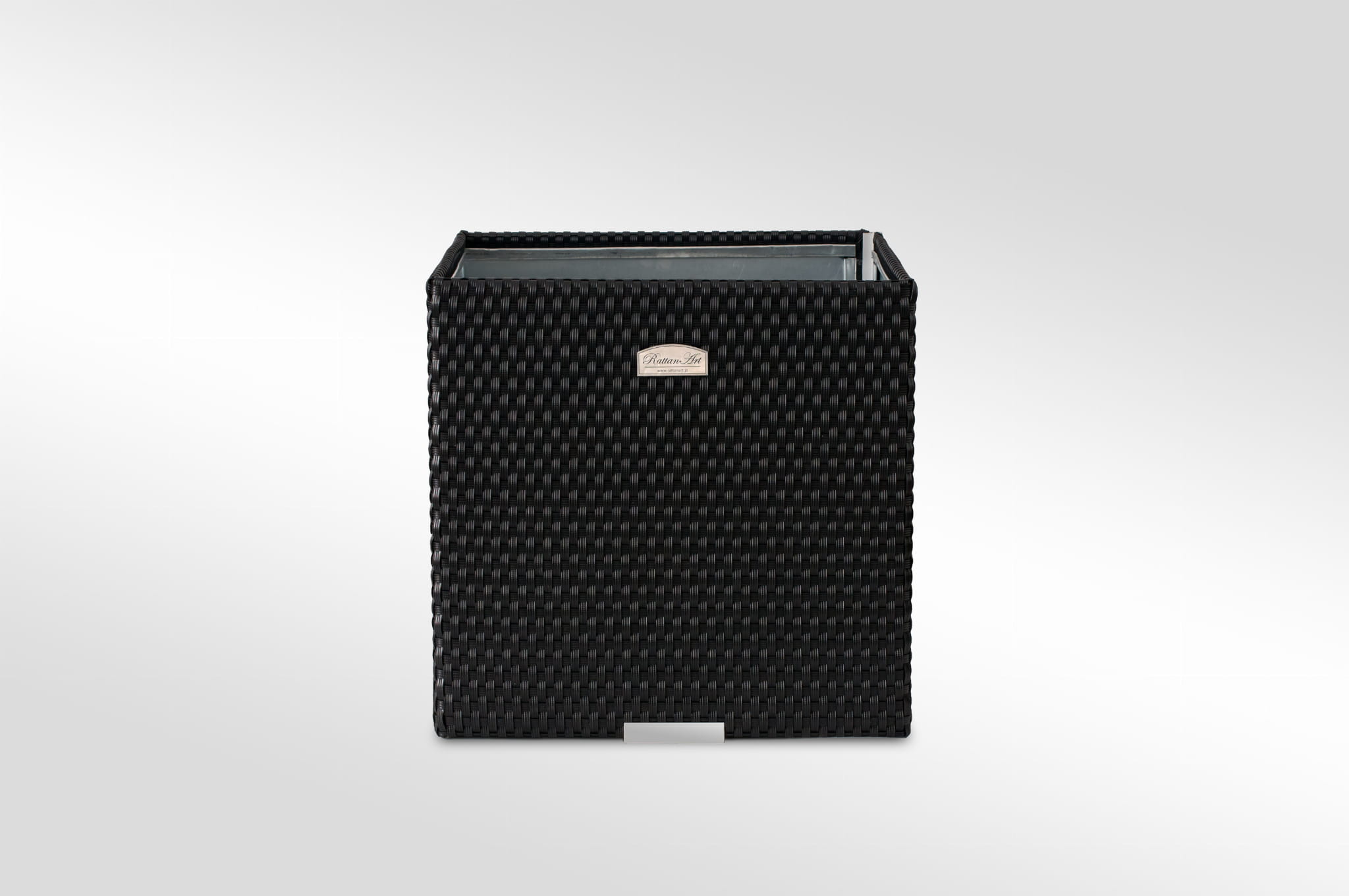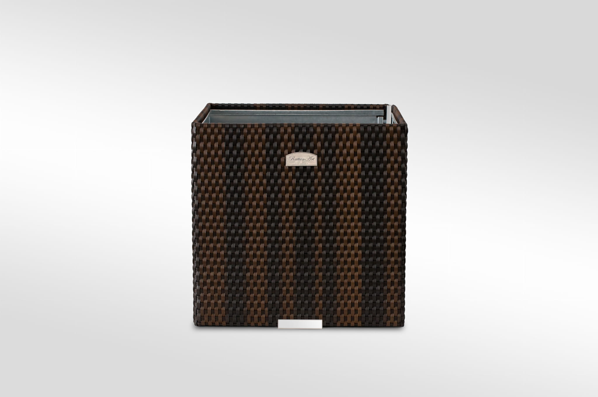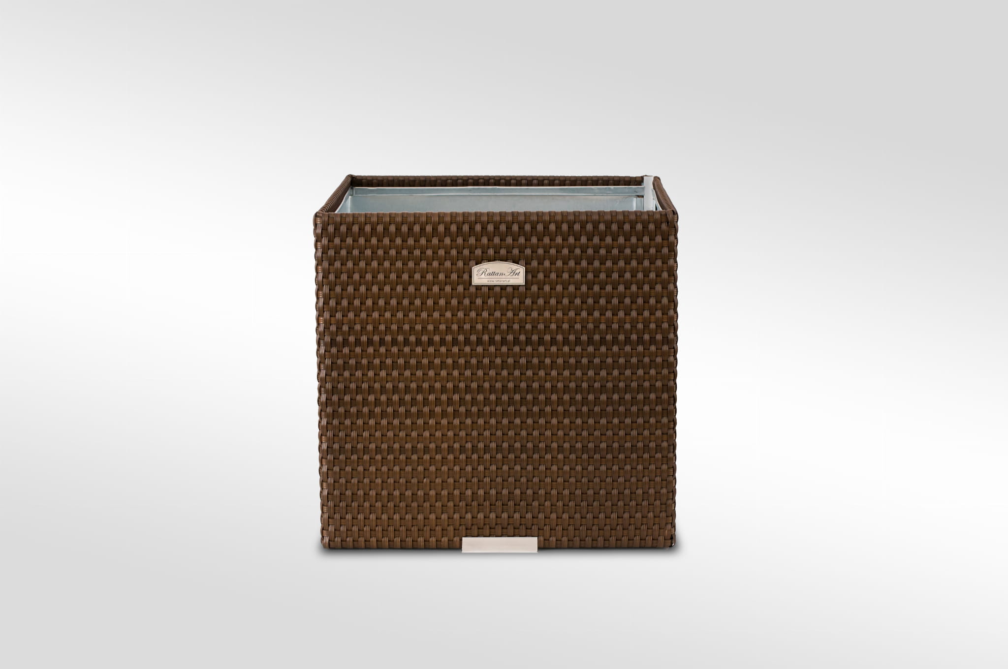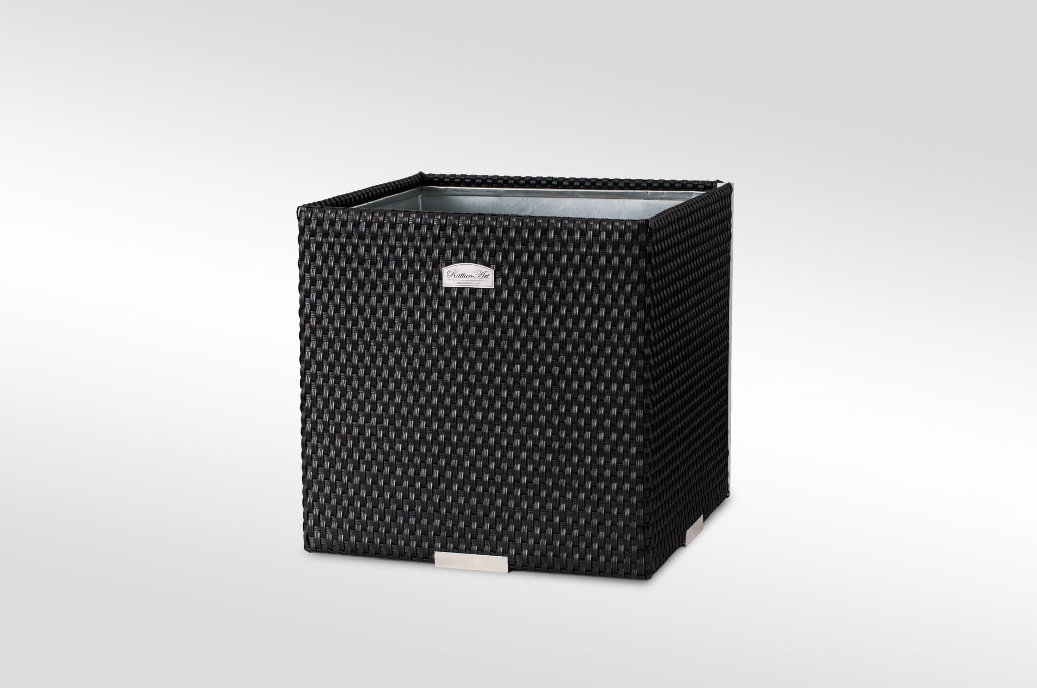 Donica wewnętrznie wykonana z blachy ocynkowanej, zewnętrznie technorattan oraz aluminium polerowane. Przystosowana do bezpośredniego sadzenia roślin.