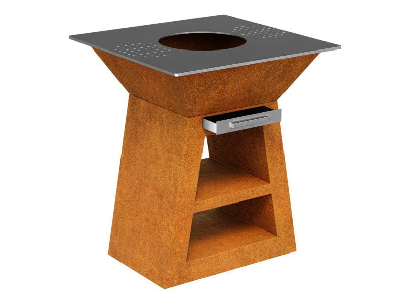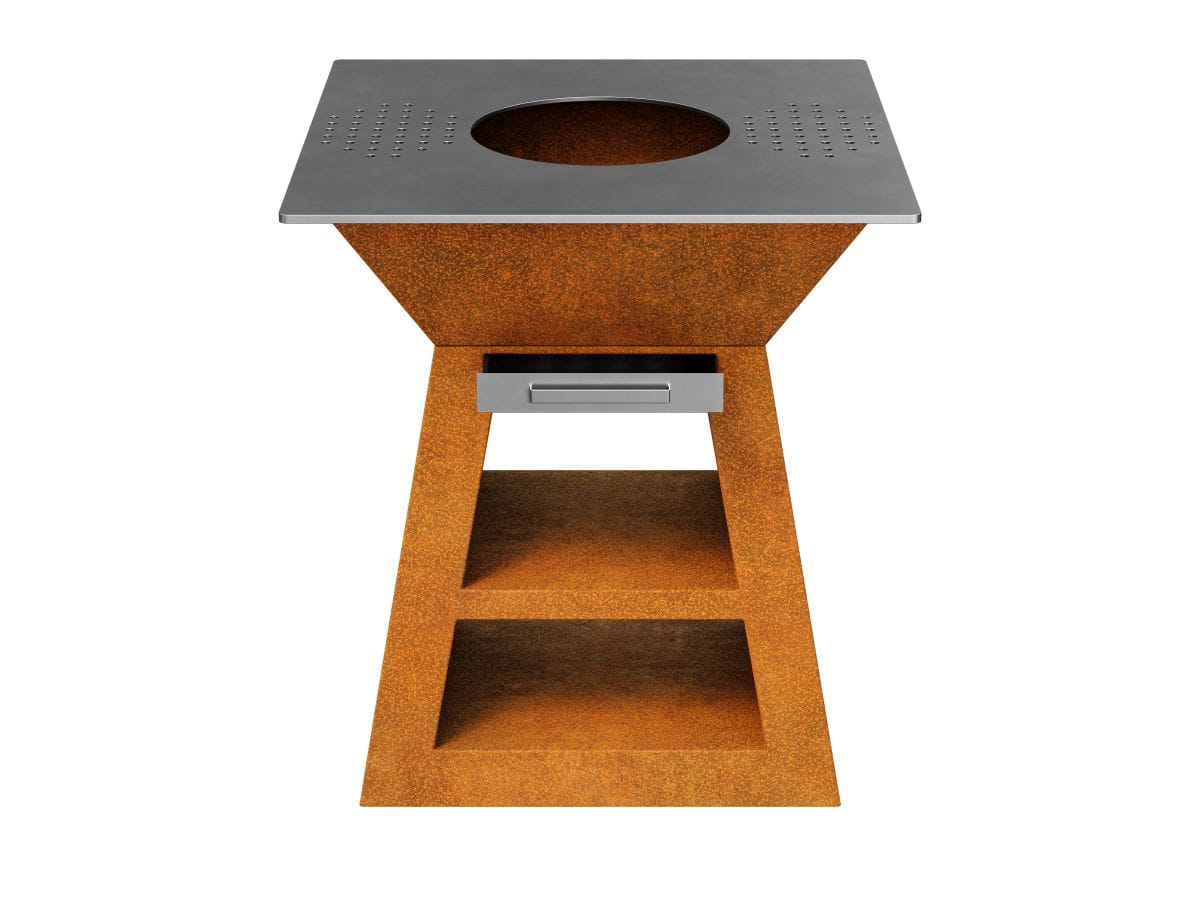 COCCINA 1 to mały trapezowy grill, palenisko i kuchnia zewnętrzna w jednym. Korpus został wykonany ze stali cor-ten, a płyta grillowa oraz ruszt ze stali nierdzewnej – dedykowanej do kontaktu z produktami spożywczymi.
