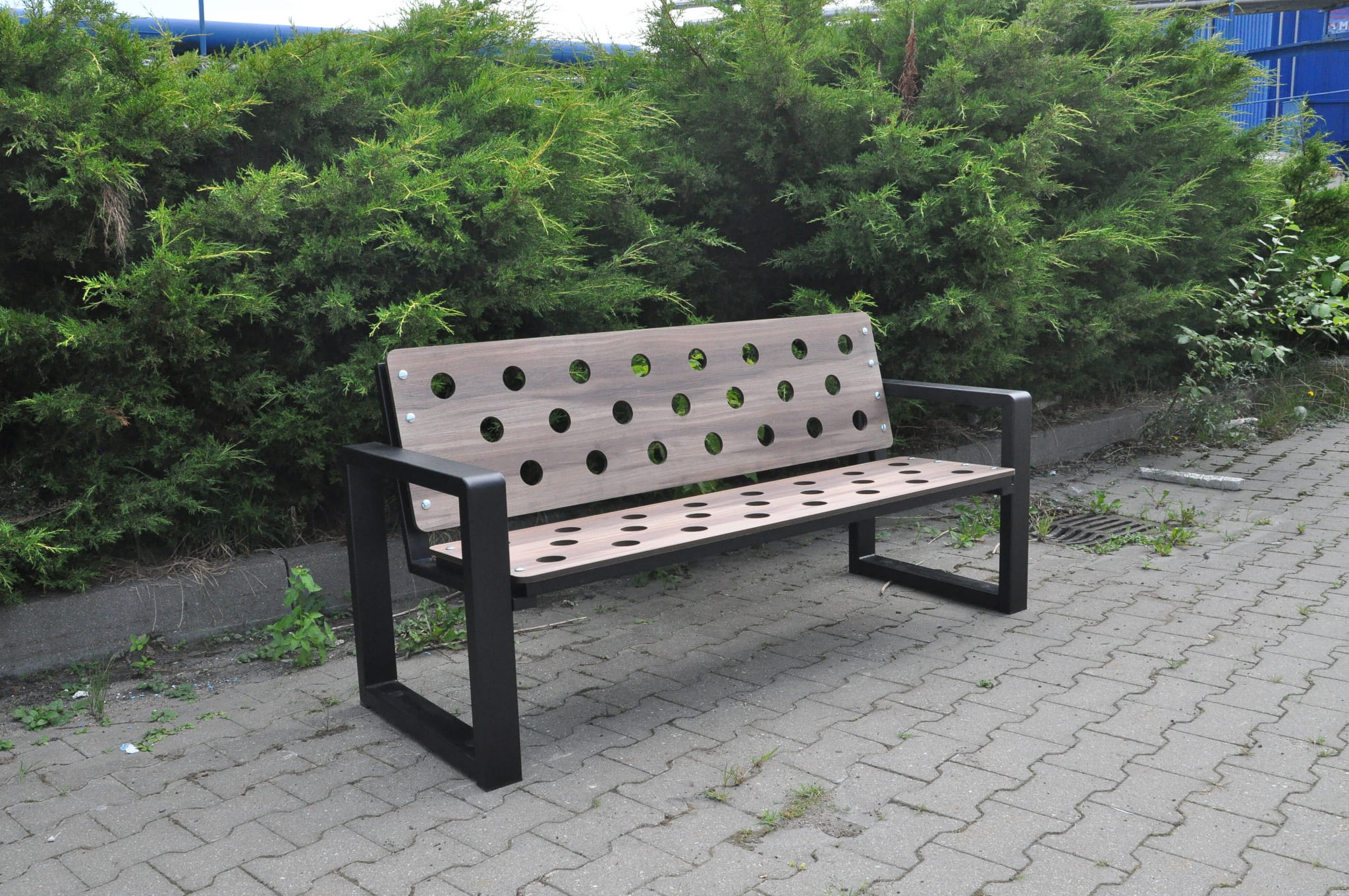 Funkcjonalna i solidna ławka ogrodowa wykonana laminatu HPL i stali malowanej proszkowo