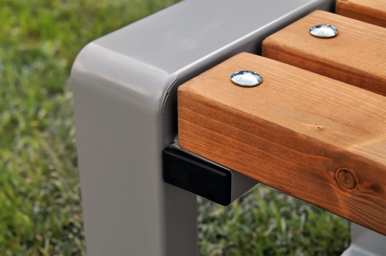 - Funkcjonalna i solidna ławka ogrodowa wykonana z drewna skandynawskiego i stali malowanej proszkowo