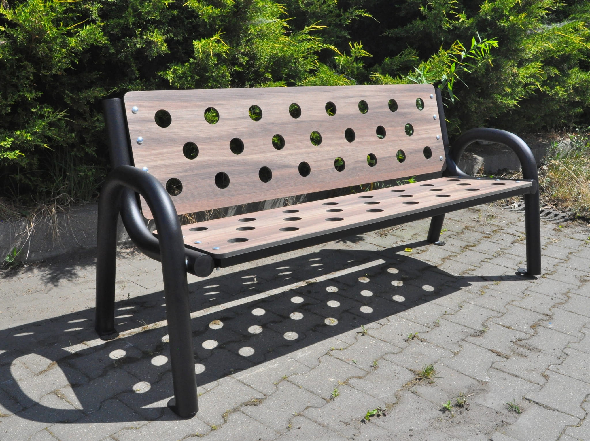 Funkcjonalna i solidna ławka ogrodowa wykonana laminatu HPL i stali malowanej proszkowo