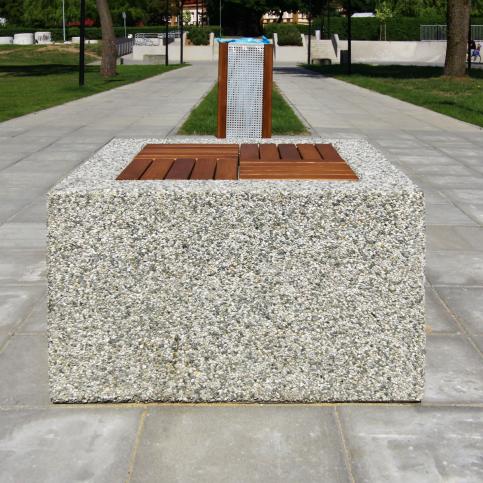 Siedzisko betonowe KRON z odeskowaniem. Siedzisko zostało wykonane w technologii betonu płukanego, dostępne jest w bogatej ofercie kolorystycznej. Elementy drewniane montowane są do elementu betonowego za pomocą stalowego stelaża.