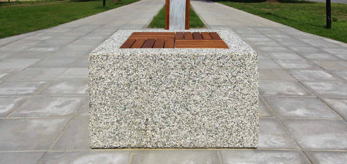 Siedzisko betonowe KRON z odeskowaniem. Siedzisko zostało wykonane w technologii betonu płukanego, dostępne jest w bogatej ofercie kolorystycznej. Firma STYL-BET posiada w swojej ofercie również ławki bez oparcia, ławki z oparciem oraz siedziska wykonane w technologii betonu płukanego oraz architektonicznego.