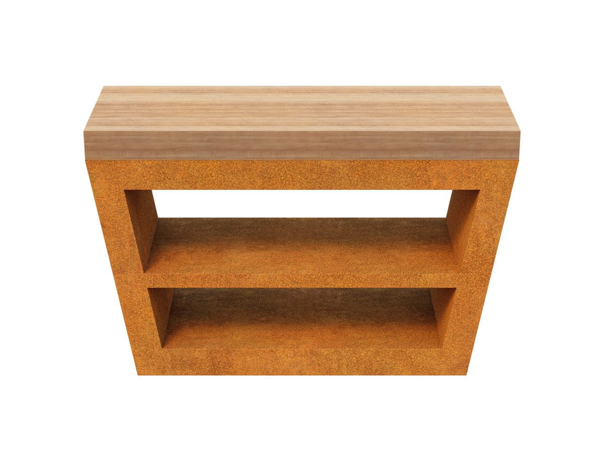 MESA 2 to średni trapezowy stół wykonany z blachy corten. Idealnie uzupełnia serię COCCINA o dodatkowy blat roboczy, półkę na akcesoria czy miejsce na drewno. Standardowo wyposażone w regulowane nóżki, natomiast istniej możliwość montażu kółek, aby stół stał się bardziej mobilny.